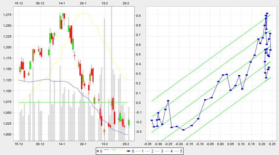 右図 横軸に指標の値、縦軸に株価をとっている。青点が日々の終値である。緑線は真ん中から一次近似、±σ、±2σを書いたものである。