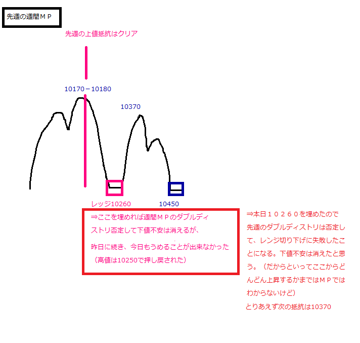 レッジ10260を埋めたので、先週のDDでレンジ切り下げ形状は否定された。下値不安は消えた感じ。