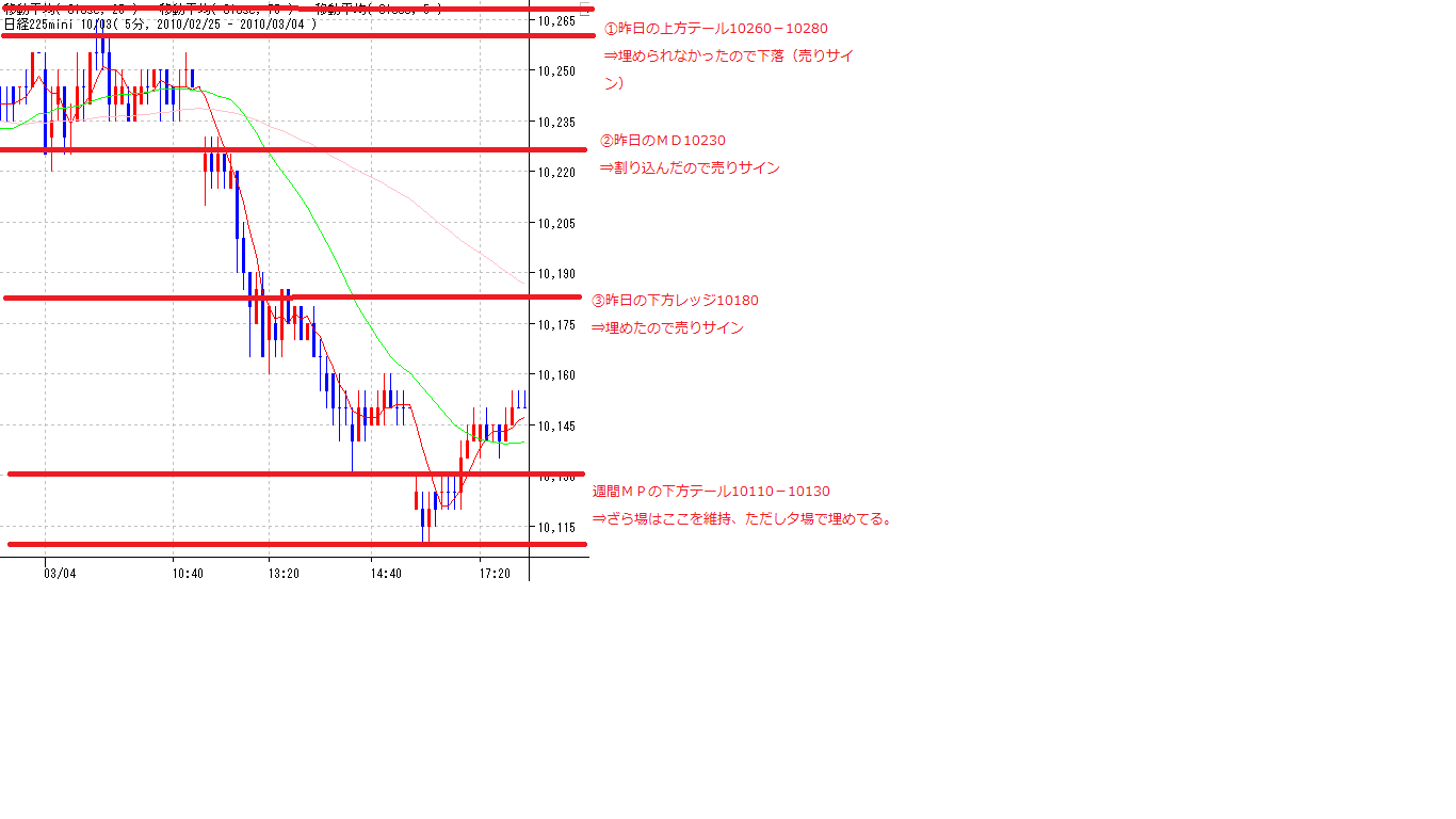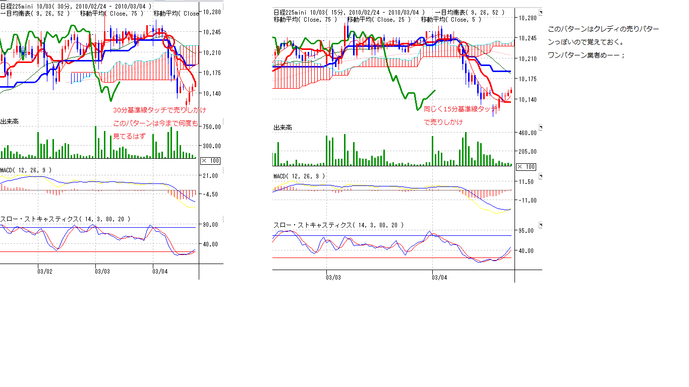 このパターンは今まで何度も紹介したと思うので、売り仕掛けが始まったと考えて途中での手出し無用。下げ止まりポイントまで待つ。