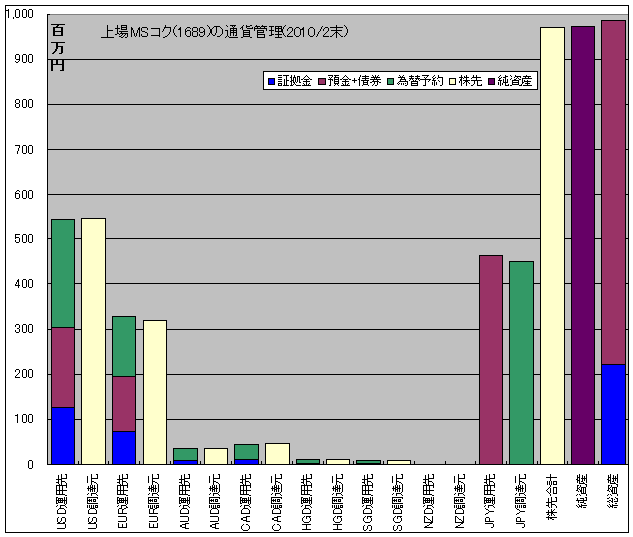 ポートフォリオは証拠金、預金債券、及び、デリバティブ(株式先物・為替予約)からなっており、フツーのファンドと違って何をしているのかわかりにくい。そこで、デリバティブを想定元本の両建てと考えて通貨毎に整理してグラフにしてみた。