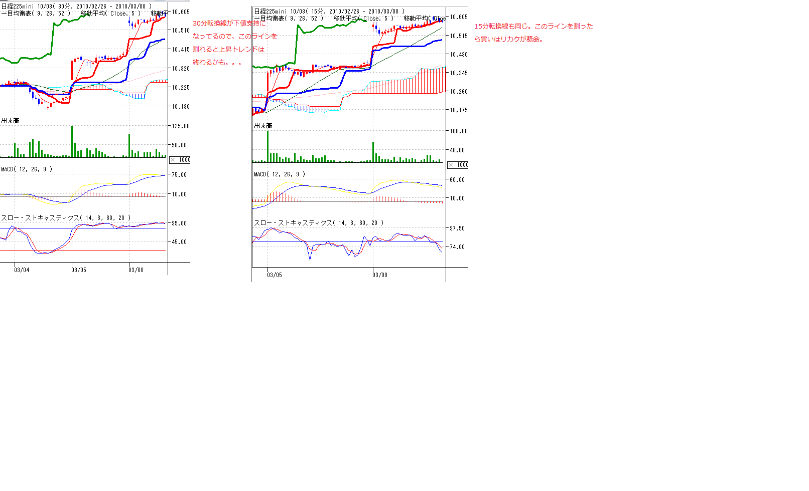 分足基準線(赤)に注目。これを割れたら買いはいったんリクイが賢明。