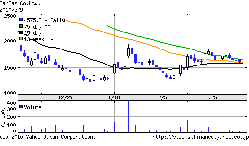 図はキャンバス(4575)の日足(3ヶ月間)です。先月半ばに25日線を突破した後は、25日線(黒)、13週平均線(オレンジ)と75日平均線(緑)とのあいだを縫うように推移してきました。今日の25日前~20日前は、5日連続で窓を開けて下げているので、ここから25日線が上向きゴールデンクロスが形成されると思われます。さて、ここからどういった値動きをするのでしょうか??