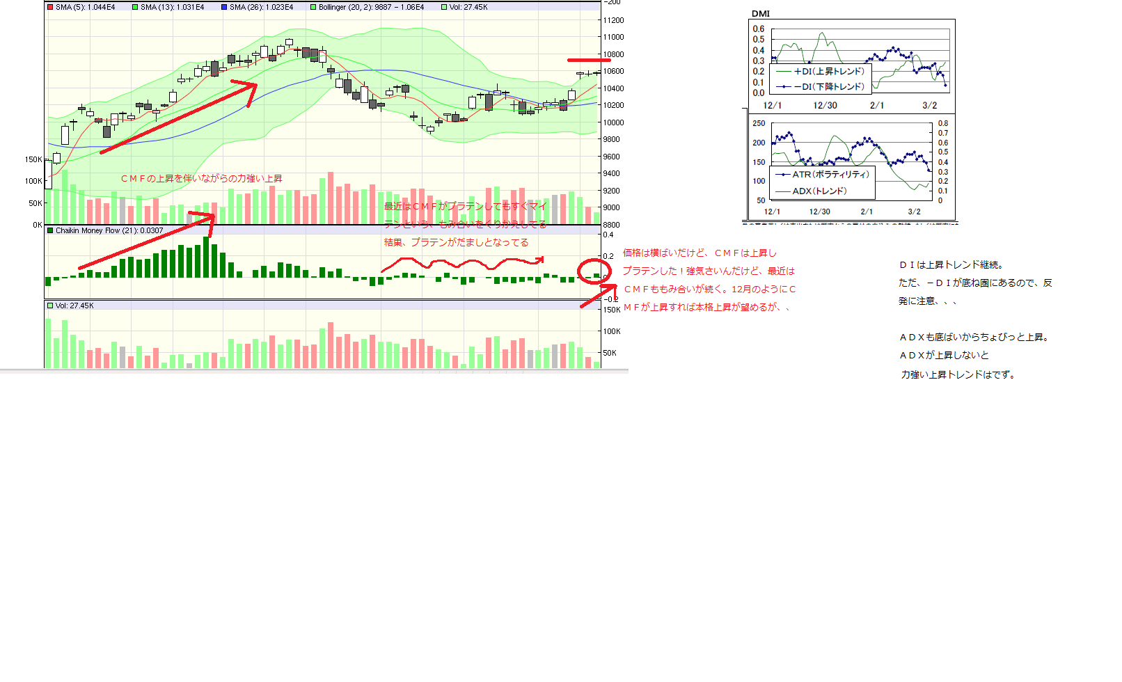 ただ、CMFも最近はプラテン下と思ったらスグニマイテン、、、ともみあいをくりかえしてる。CMFの上昇を伴った上昇でないと、12月のような力強い上昇は望めない。