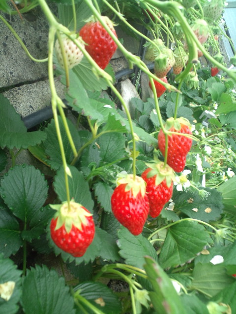 ここはビニールハウスの中に石垣が組んであり、そこにイチゴが植えられています。