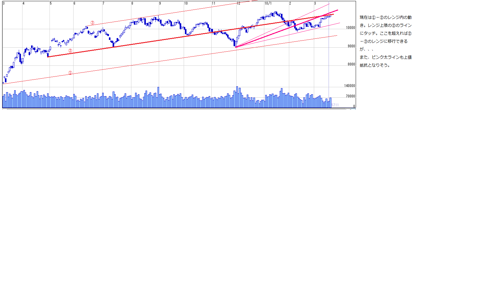>10705売りを10730でロスカット。再度、トレンドライン上限タッチ10795で売り
