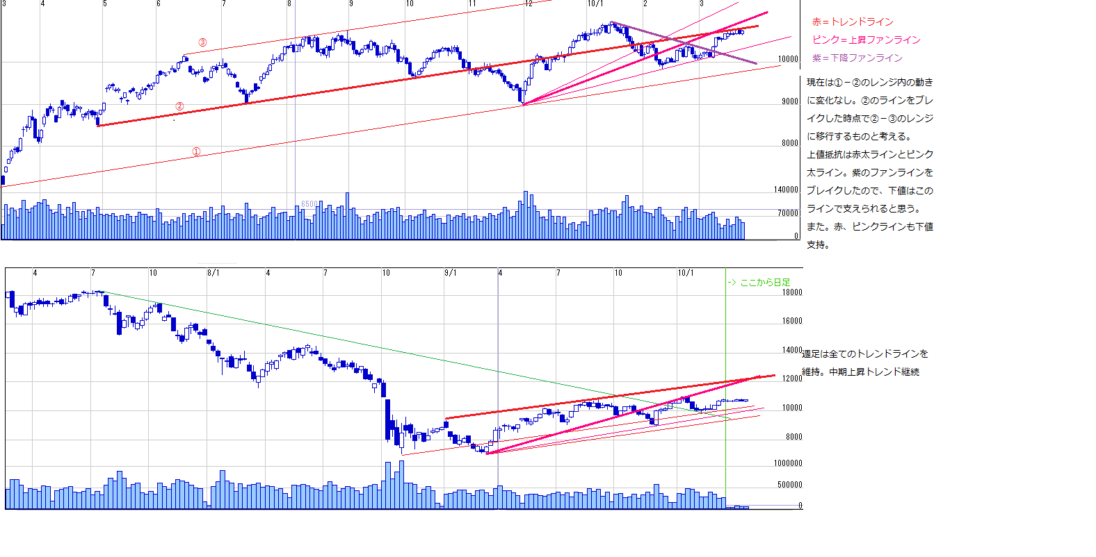 ・日足ボリバンは上放れて拡張が続くが、若干拡張がやみ、収縮へ向かいそうなかんじがするので注意。