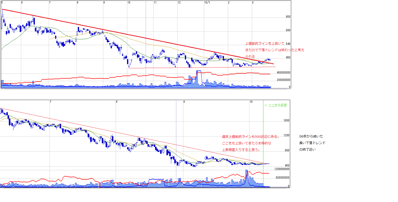 チャート的には復活の兆しありなんですけど、そう思うといつも悪材料でどっすーん↓みたいなのあったんですけど、さすがに悪材料も出尽くし、本格上昇には入れるかもしれないと期待してます^^ただし、個別銘柄はチャートより、ファンダメンタルに左右されるので注意が必要ですが、、、