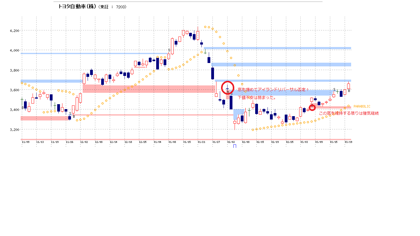 ・3日にあけた窓を埋めたのでアイランドリバーサル否定となった。下値不安はチャート上では消えた感じ。