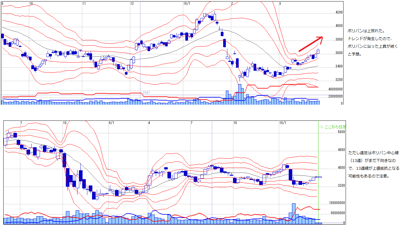 ・日足ボリバンは上放れたので上昇トレンド発生。