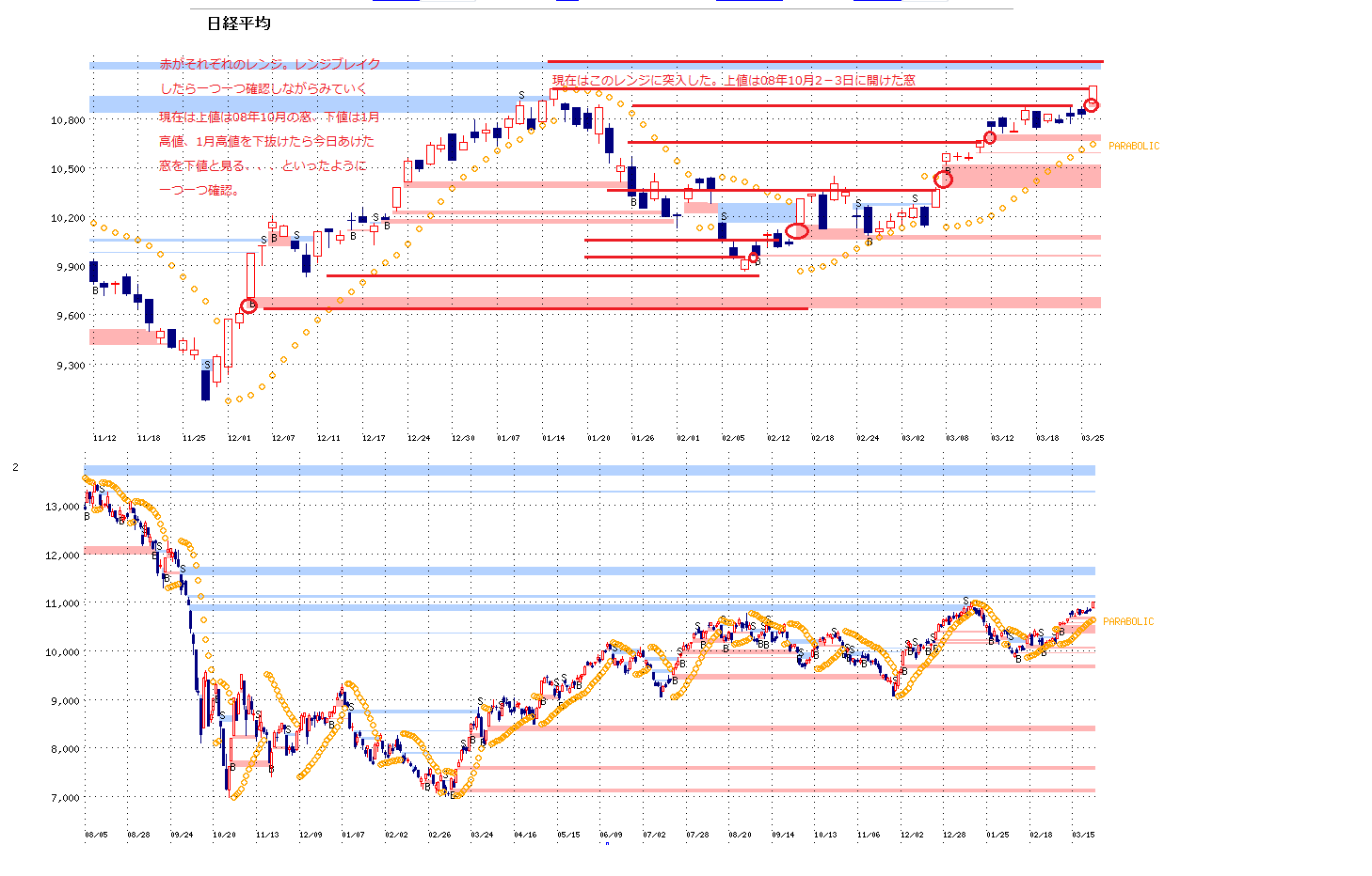1月高値を下抜けたら下値は今日開けた窓までレンジが広がる、、、といったように、ひとつひとつ確認していけばいい。