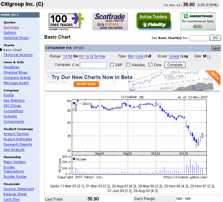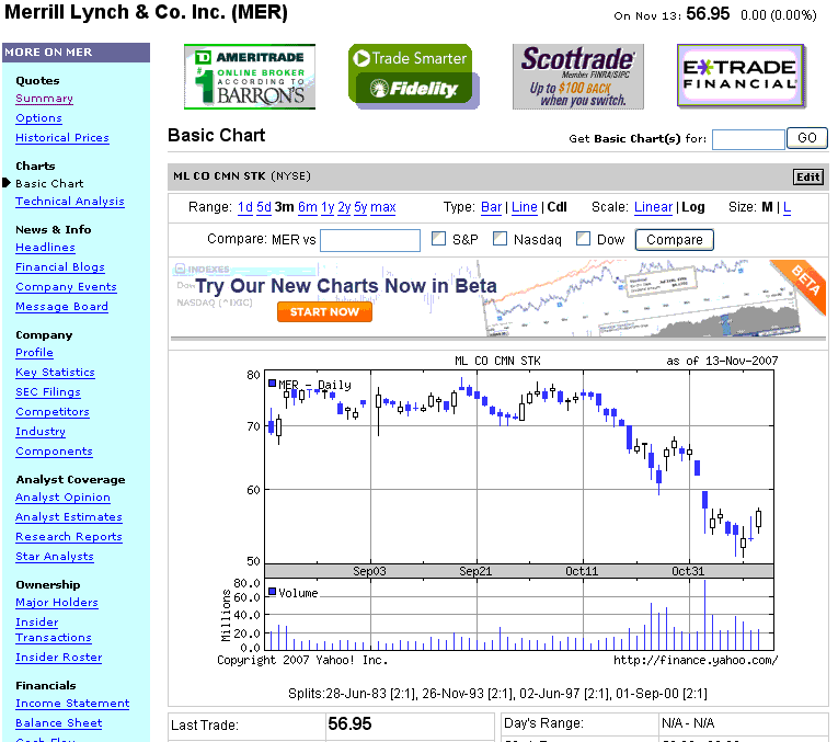 ・NY市場は大幅高。ダウは前日比+319ドル、ナスダック総合指数は+89ポイント。トリガーになったのは、ウォルマートの3Q決算が予想よりも良かったことと、GSのサブプライムの損失そんなにないよ発言。全てが好転するような材料ではないのですが、ここ数日の下落の仕方が急だったのでテクニカル面から反発し、溜まってた買い意欲とショートカバーが殺到した感じですね。原油価格は下落。為替は再び円安方向へ。