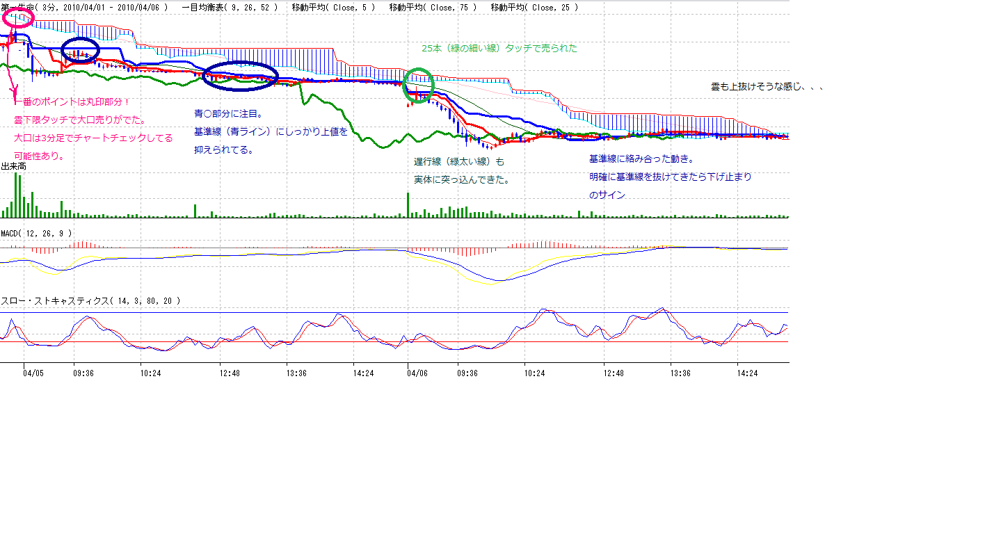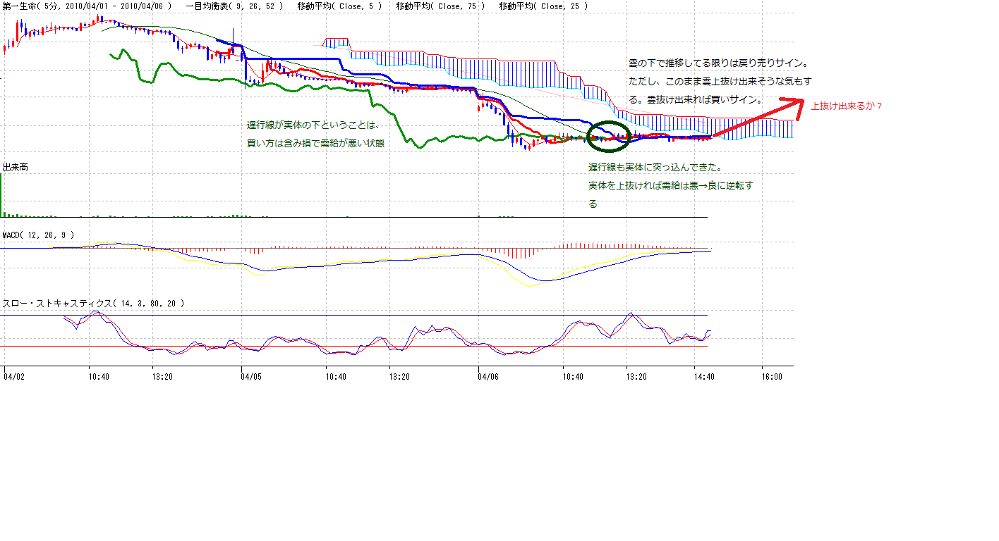 このまま基準線をこえられない、雲をなかなかぬけられないなら、一段安、基準線・雲を上ぬけてきたら需給は反転するので、一応買いサインではあります。