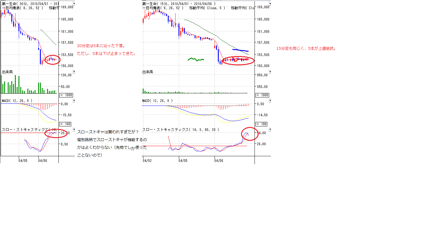 第一生命は3分足を見てください。ここまでわかりやすいチャート形状はありません^^;分足をみていれば、高値で飛びつき買いすることはなかったと思います。