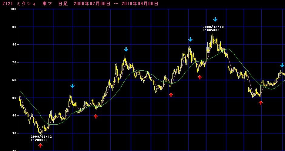 赤の矢印で買い、青の矢印で売る