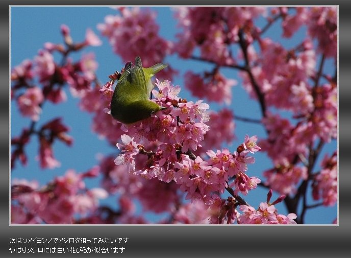 写真は、桜の花の蜜を吸うメジロですが、わたしのデジカメではこんなにきれいに撮れないですぅ    ●┏┓...