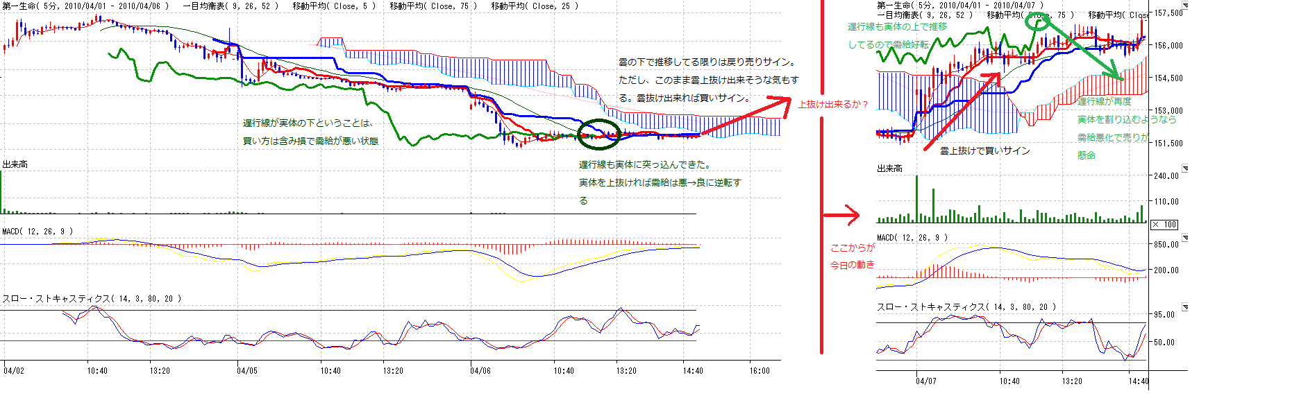 ・遅行線に注目。遅行線が今は実体の上で推移してるので、買い有利、ただし、再度実体を割り込んでくると需給悪化で売り優位