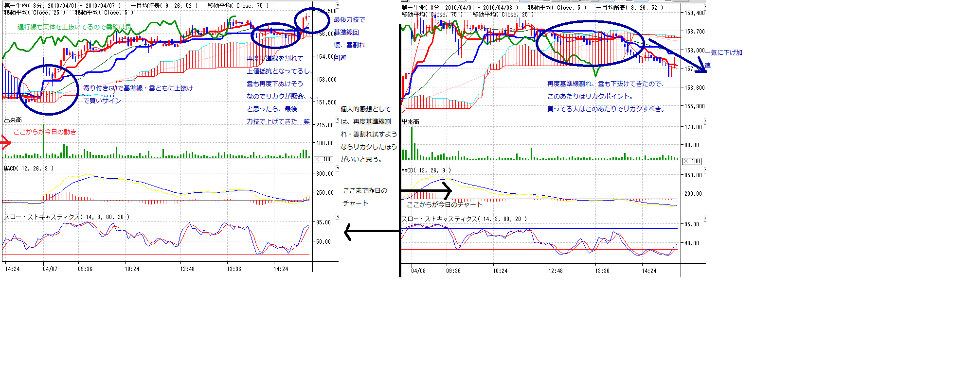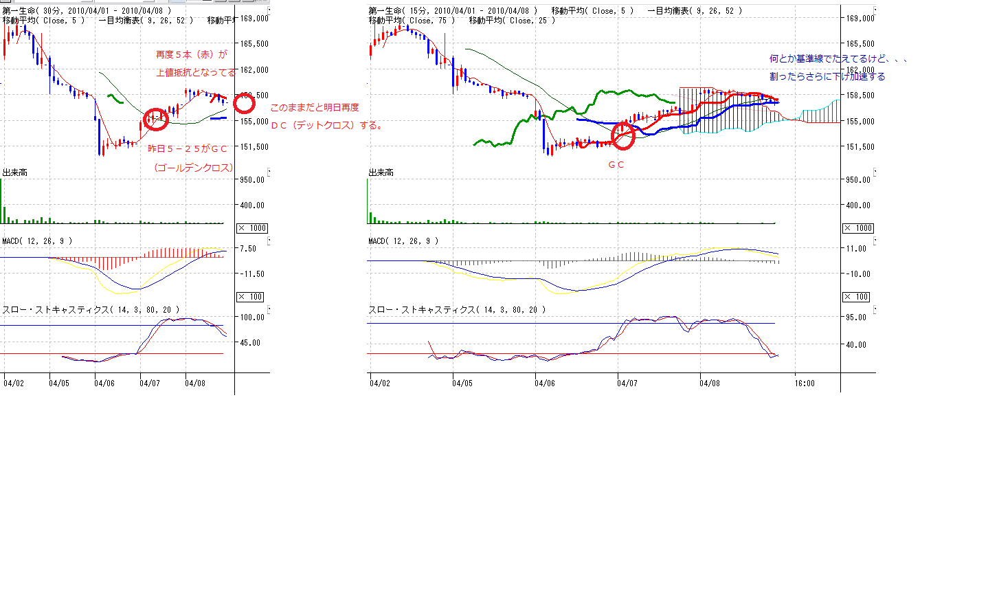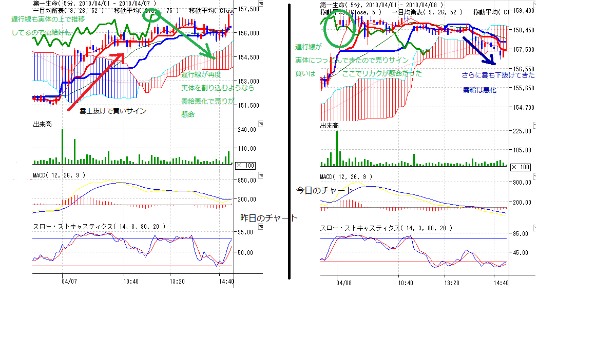 ・昨日最後力業で回復下基準線を、再度割り込んで上値抵抗となってしまってるので、ここはリカクポイントでした。基準線割れ、雲下抜けで最後下げ加速したものと考えられます。