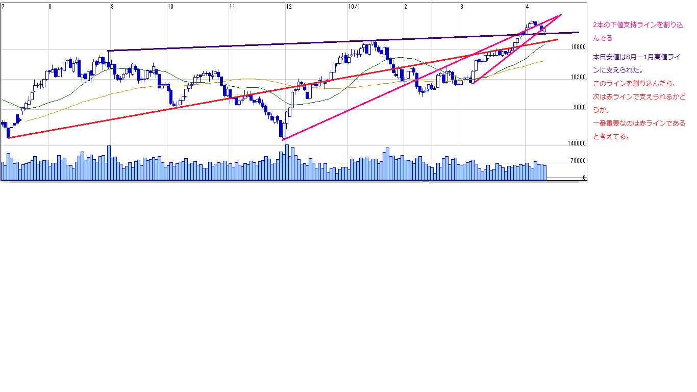 2本の下値支持ラインをブレイクし、かろうじて9-1月高値ラインで支えられてる。3月初頭からのトレンドはいったん終了したと考える。12月からのトレンドはまだ継続してる。