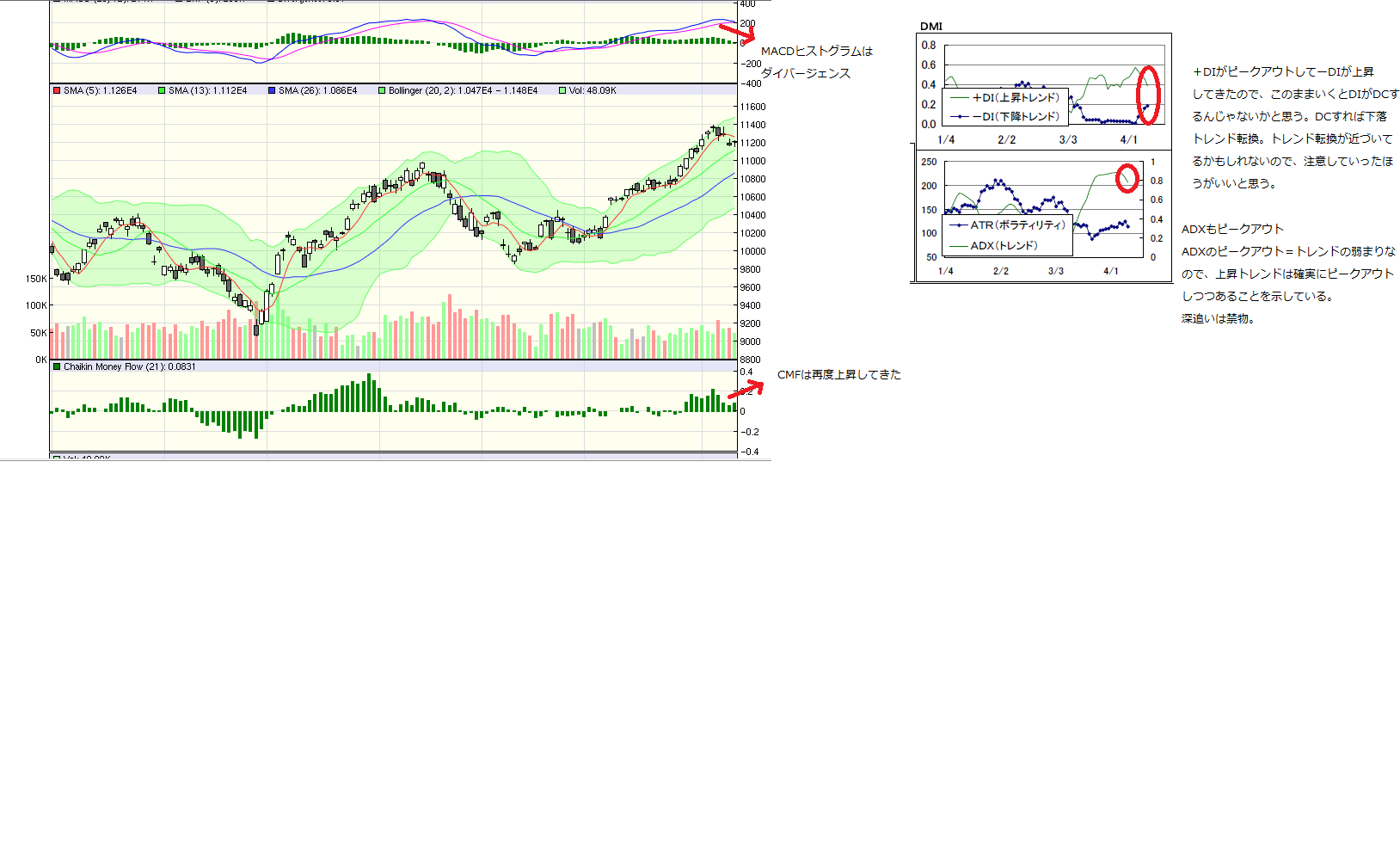 ん~ 個人的には、ちょっと注意する段階に入ってきたのではないかな~と思ってます。DMIに変化でてきたのと、トレンドライン割れてしまってるので、3月からの上昇トレンドは終了、今はかろうじて12月からのトレンドを維持してる感じですけど、、、