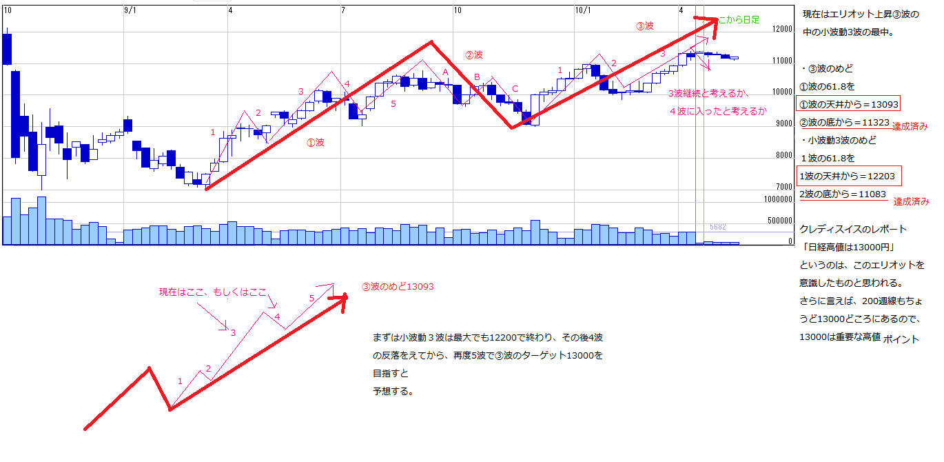 まずは小波動3波の上値めど(最大で12200)達成後に小波動4波の下げ(押し目)をはさんだ後に、小波動5波の上昇で第③波の上値めど13093を目指す。