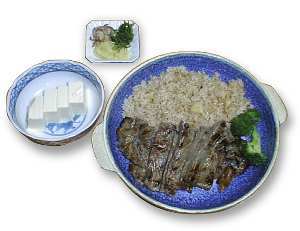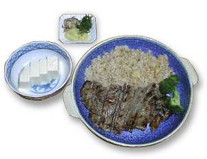 4.肉を適当な大きさにカットしてガーリックライスに添えて出来上がり。