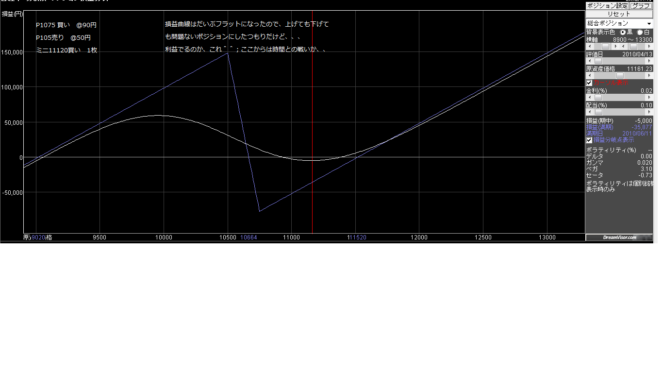 持ち越し中のプットデビットに加えて、今日は11120でミニ買い追加して、デルタをフラットにしてみました。