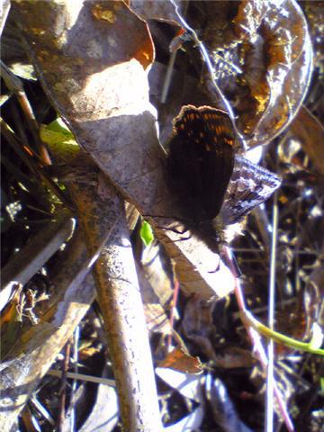 ちょう ミヤマセセリ かいしょの森:ミヤマセセリ、チョウ目 セセリチョウ科 チャマダラセセリ亜科 食草は、クヌギ、コナラ、カシワ。早春の蝶です。落ち葉にまぎれて全くわかりません。擬態しているのでしょう。このほかクロコノマチョウなどもいました。2010.4.8かいしょの森にて。