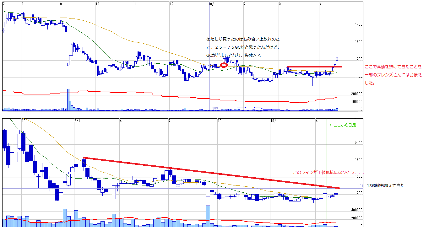 1月に25-75ゴールデンクロスか?と思って買った銘柄ですが、そのGCがだましとなり、しばらく悩まされた銘柄ですーー;ちと、買うのが早すぎた><