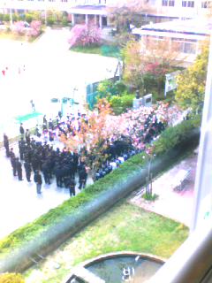 早稲田と提携したということで、なぜか学校に大隈重信像がやってきました(>_その除幕式の様子(教室前廊下よりこっそり撮影)です。