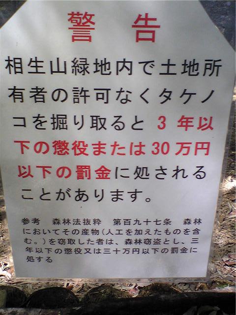 さすがに30万円の罰金ともなると、この看板を見て相生山緑地でタケノコを掘ろうとする人は減るでしょうね。