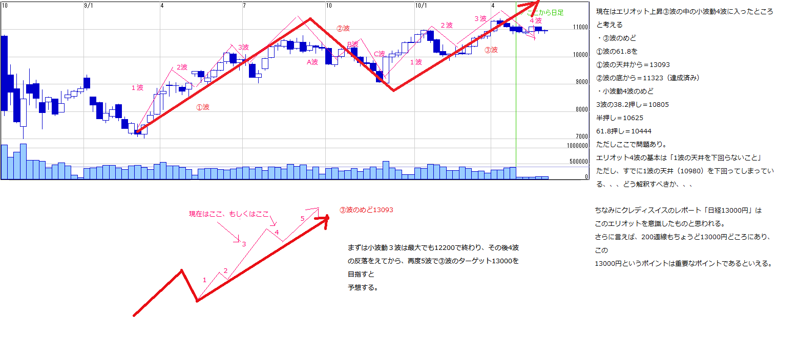 まずは小波動3波の上値めど(最大で12200)達成後に小波動4波の下げ(押し目)をはさんだ後に、小波動5波の上昇で第③波の上値めど13093を目指す。