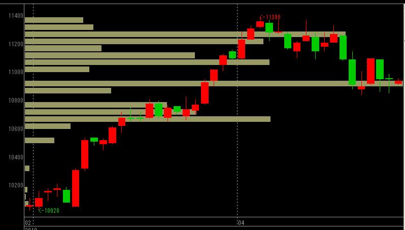 過去1ヶ月のものと2ヶ月のものを見てみると、現在の10920に大きなカベがあります。また、下では、10640あたり、上では10040あたりでしょうか?