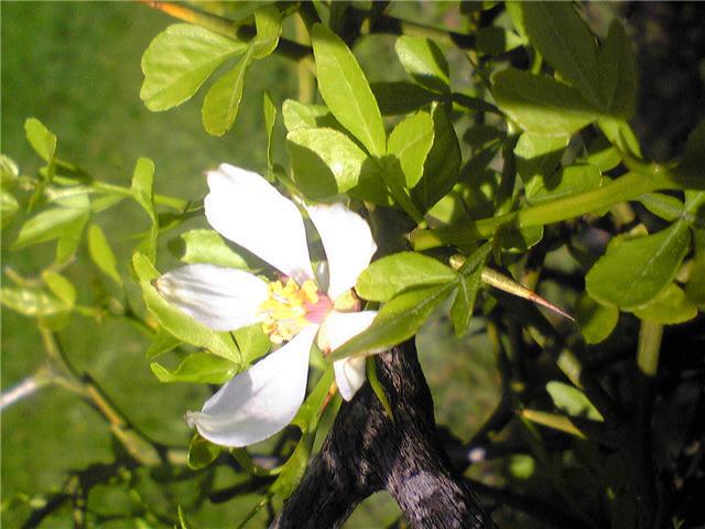 樹高は2-4mほど。枝に稜角があり、3cmにもなる鋭い刺が互生する。この刺は葉の変形したもの、あるいは枝の変形したものという説がある。