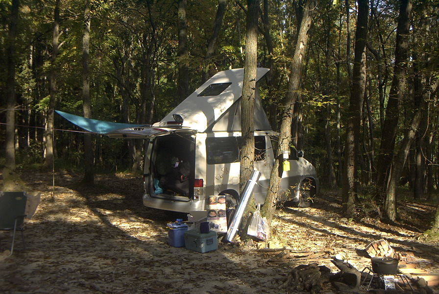 翌朝は寒さで目覚める曇り空、コーヒーを沸かし、ダッジオーブンで鳥料理、ステーキと一通りメニューをこなした頃には雨足強くなり全員ずぶ濡れで撤収作業。