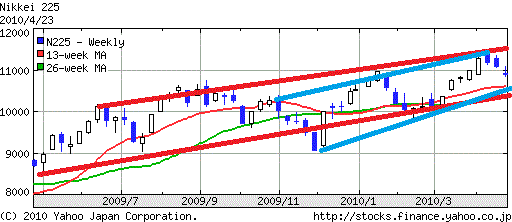 今週の予想レンジはとっても狭く10800~11100にしてみます。これだけ狭いと外れるでしょうね。証券会社の5,600円単位のレンジでも外れるんですから。