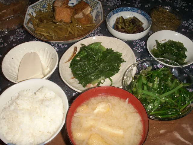 本日収穫の山菜中心のおかずです