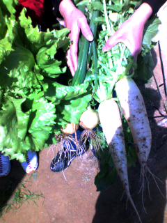 東大寺の後は昼食を食べ、信貴山のどか村というところへ行きました。そこではイチゴ狩りをはじめ、大根などの野菜、卵、シイタケなどを手に入れました。