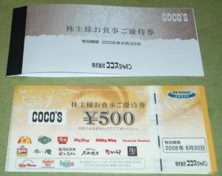 ココス弊店してしまったんですね、私はココス系ではエルトリートとかは行きますが、ファミレスはあんま行かないですねf(^^;)一応ココスの優待分で調度半年もつので親のゼンショーの方はオークションに流しちゃう事が多いっす(^^)(前回のは友達との宴会で使い切っちゃいましたがf(^^;))