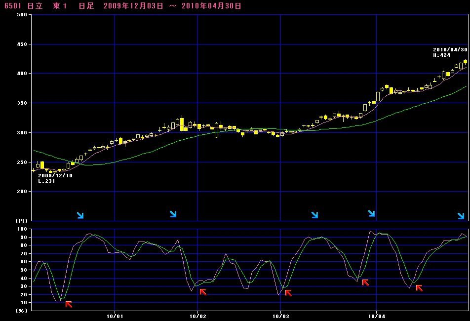 写真(例:6501:日立)の赤の矢印で買い、青の矢印で売りです