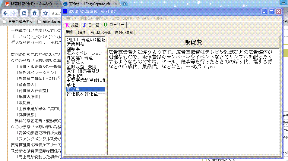(本の感想も書いてしまいました(^^;)。みんかぶで継続的に勉強するために、単語帳つくりました。調べてわかった事を日記に載せるだけでは、忘れてたときにその説明を読み返すのが面倒なので。フリーソフト「ポリポリの単語帳」を使わしていただきました。