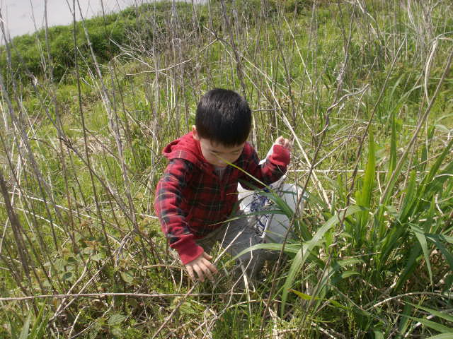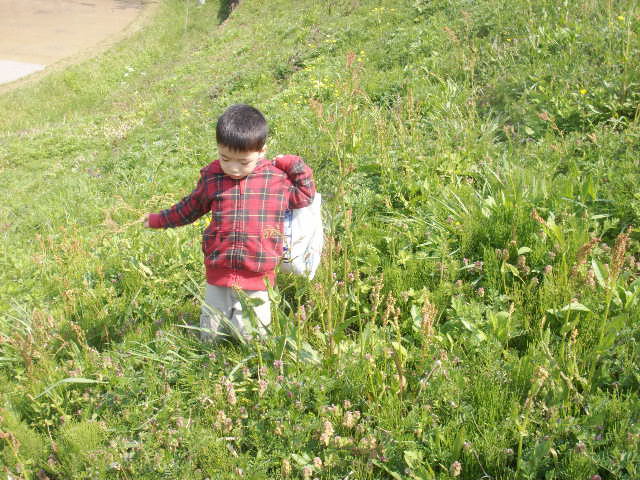 完全にオムツが取れたのでなく、紙パンツの孫と二人で九頭龍川の支流の日野川の土手です