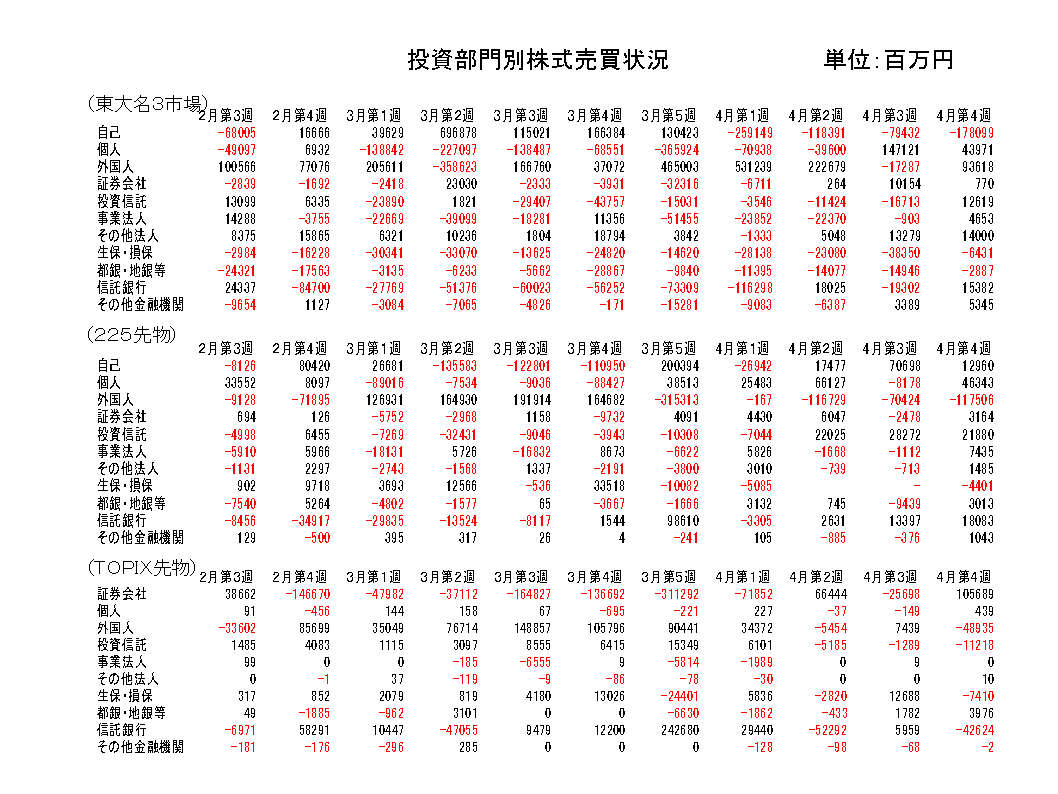 生保・損保は売り越し継続です。TOPIXは売り越しに転換。