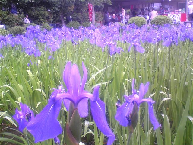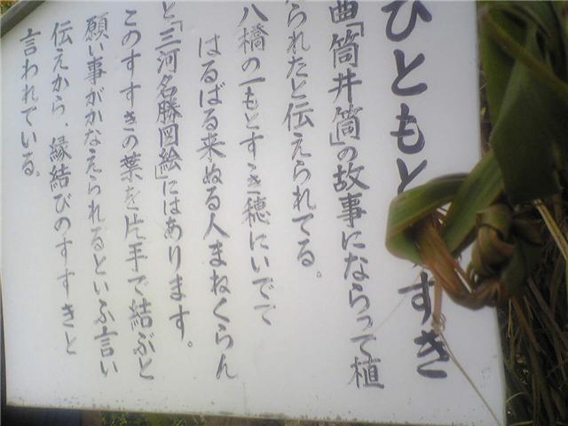 写真は八橋かきつばた園、ひともとすすき:ひともとすすきは謡曲「井筒」の故事にならって植えられたと伝えられ、このすすきの葉を片手で結ぶと願いごとがかなえられるという言い伝えから縁結びのすすきと云われている。