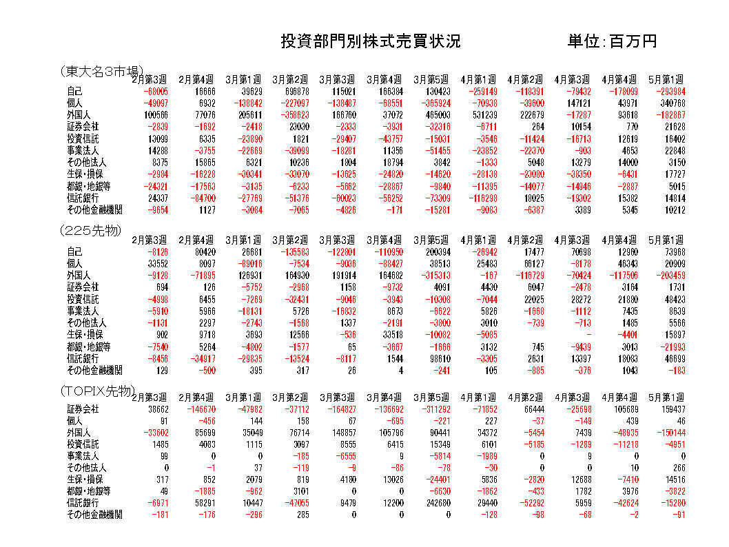 株券については国内勢がオール買い越し、外国人が売り越しという構図になりました。