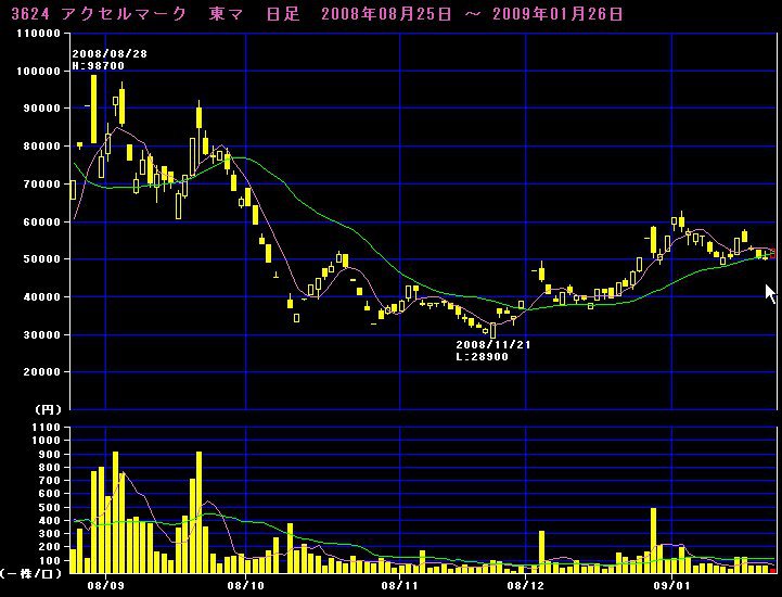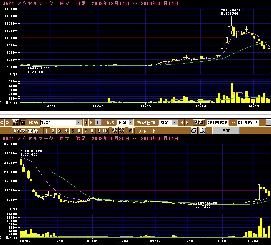 写真2:昨日までの日足(上)と、週足(下)です 赤線は10万円です