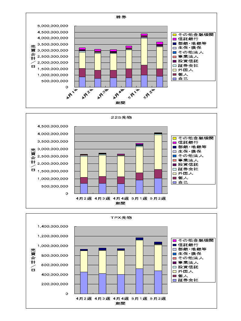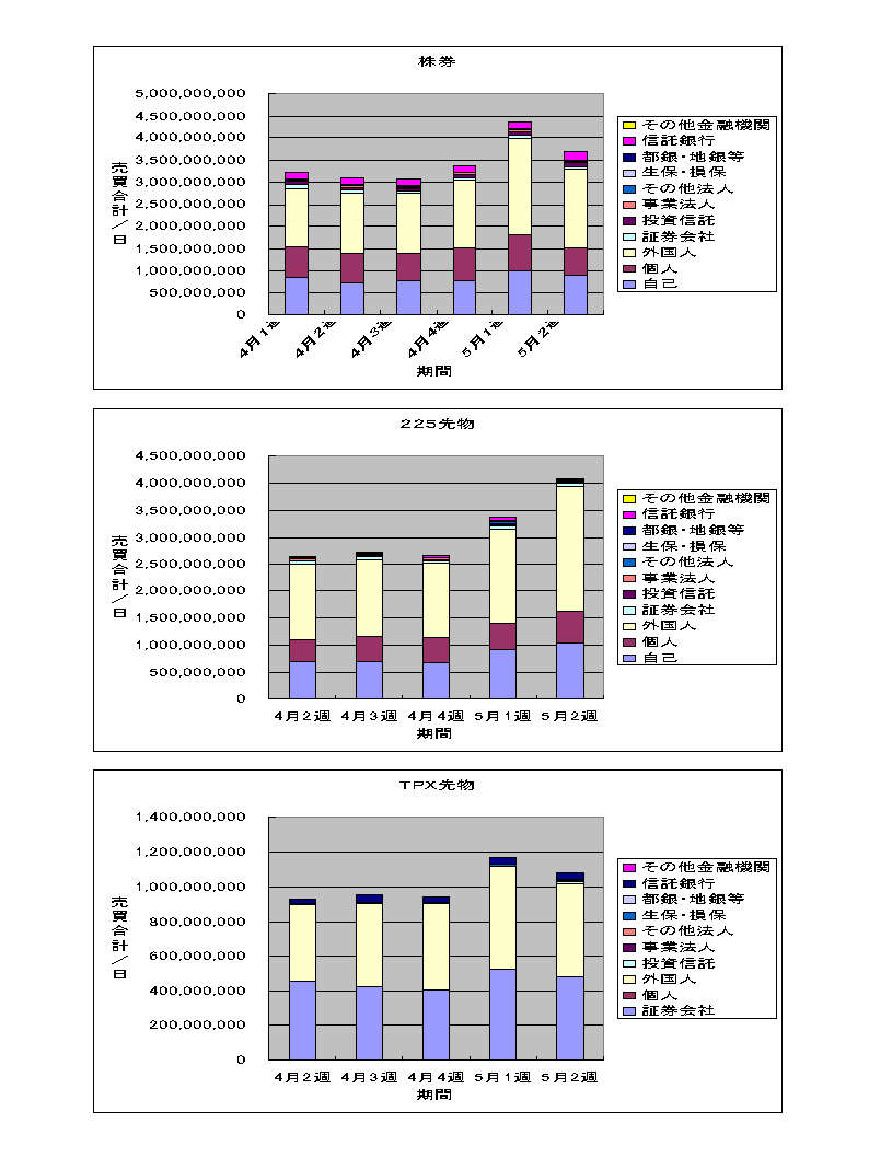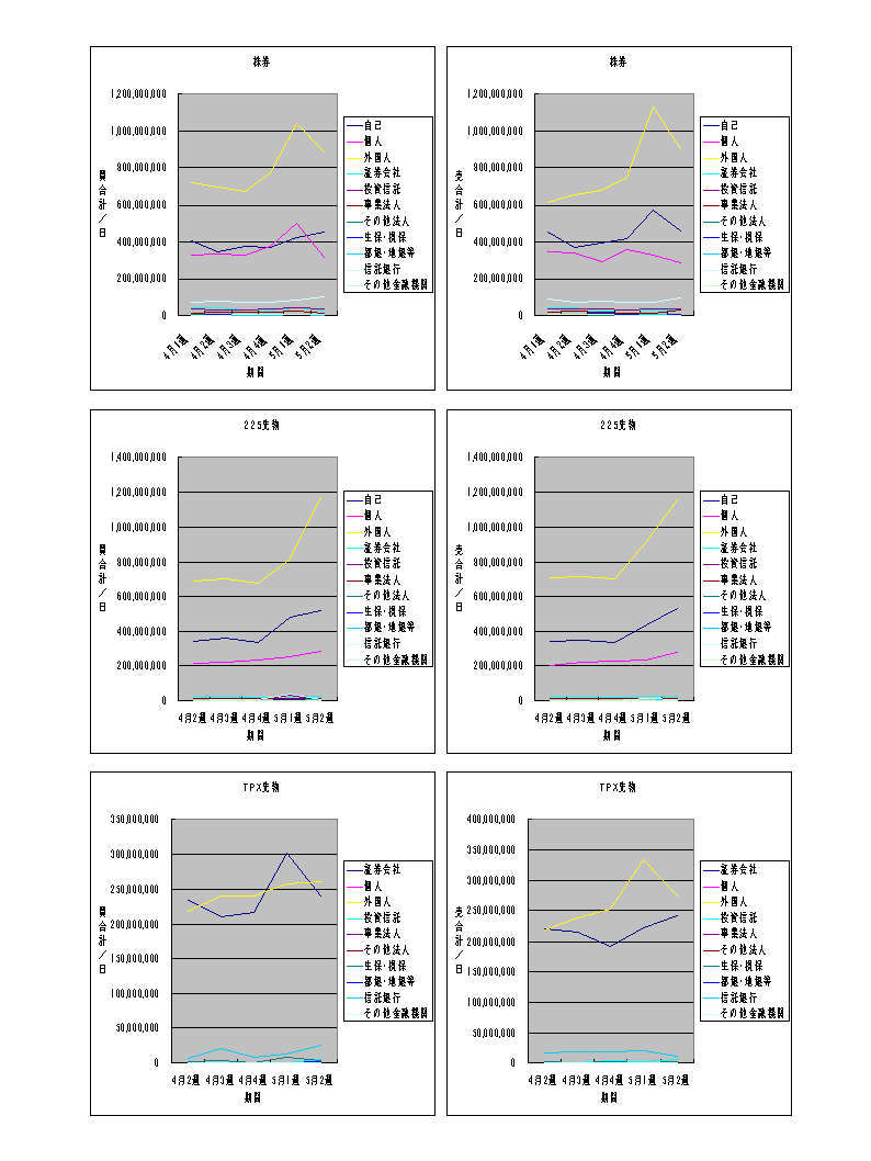株券に関しては、折れ線グラフで見ると、トレンドリーダーの外国人が5月1週でピークアウトしたようにも見えますが、売り合計も減少しており、5月1週が2日間しかなかったため、1日あたりの出来高が膨らんだと考える方が自然ではないかと思われます。
