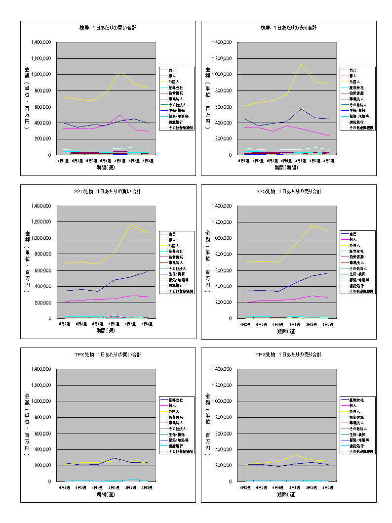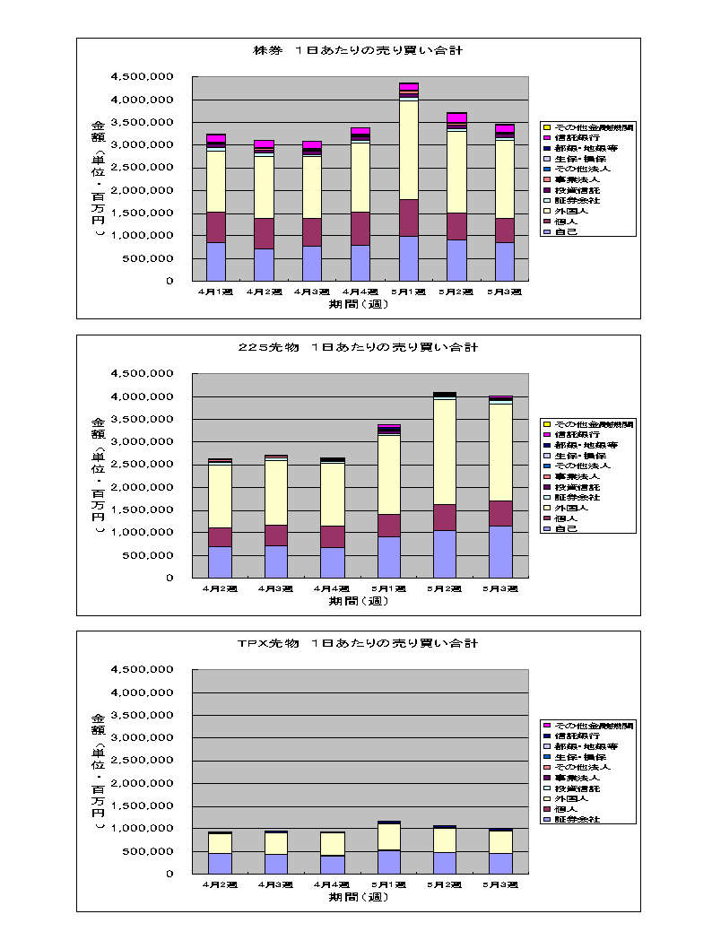 株券も先物も4月と比べれば依然として高水準の売買金額を保っており、特に減少したという印象はありませんが、5月にはいってからの株価の急落を考えると「買い」といっても買い上がらない「返済買い」がほとんどと見るべきだったのでしょうか。
