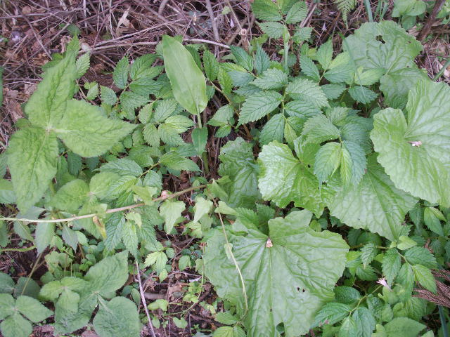 右がミツバ、 中央上の尖ったのがミョウガの芽、左の大きいのがヤマワサビ、全体に生えてるのがミズ(ウワバミソウ、ミズナ、カタハ等の言い方があります)