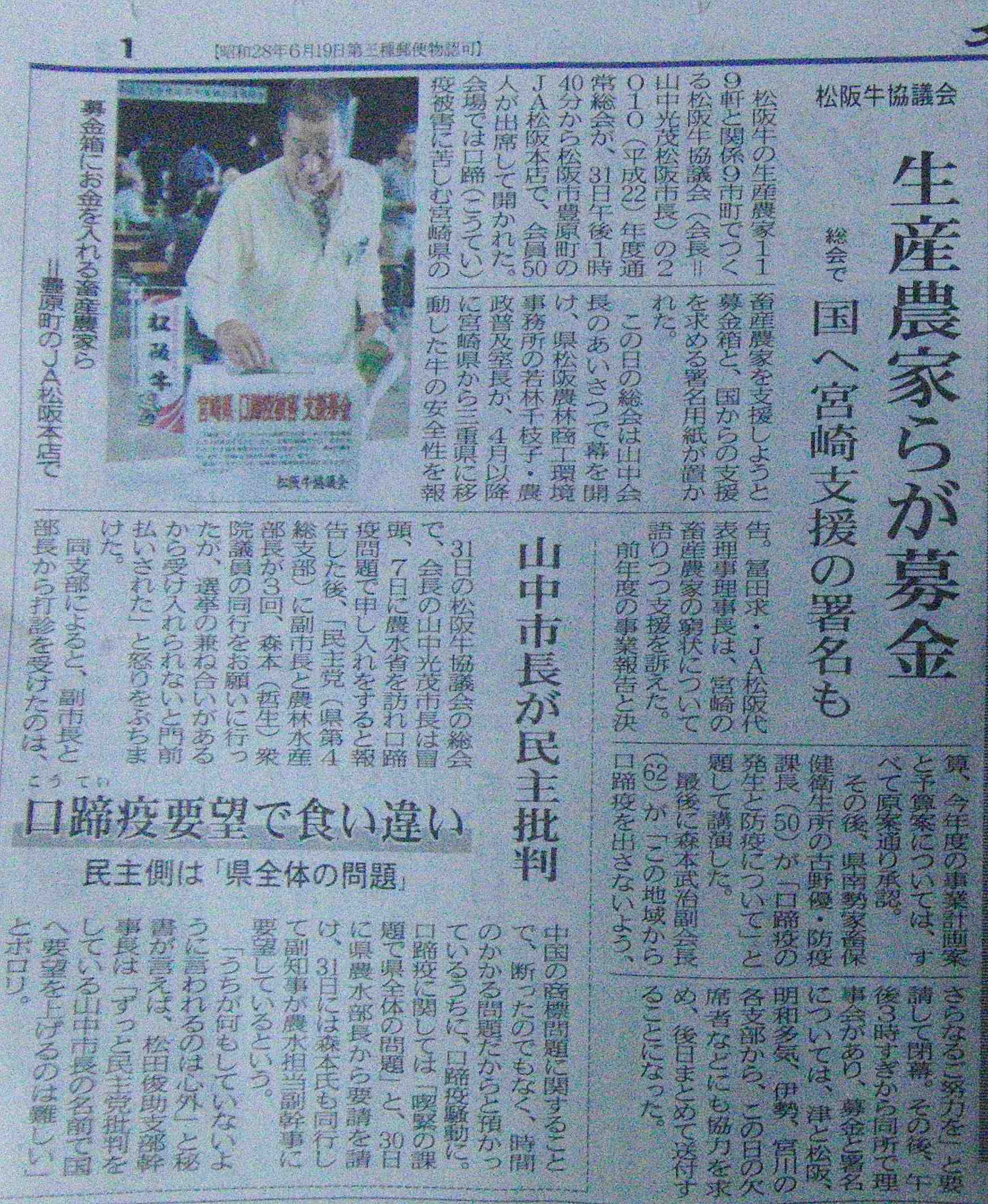 ”31日の松阪牛協議会の総会で、会長の山中光茂市長は冒頭、7日に農水省を訪れ口蹄疫問題で申し入れをすると報告した後、「民主党(県第4総支部)に副市長と農林水産部長が3回、森本(哲生) 衆議院議員の動向をお願いに行ったが、選挙の兼ね合いがあるから受け入れられないと門前払いされた」と怒りをぶちまけた。