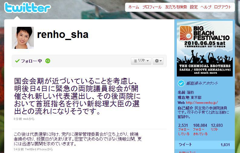 twitterのいいところ 首相辞任~ 蓮舫さん